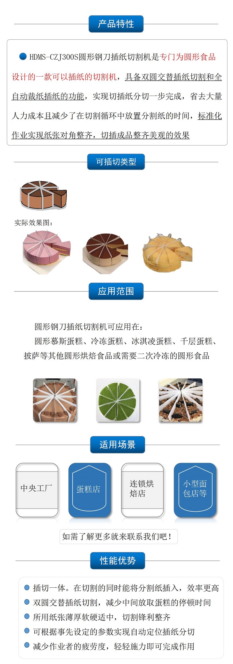 該設(shè)備利用超聲波高頻振動(dòng)切割,可同時(shí)插紙切割一個(gè)圓形的蛋糕 |